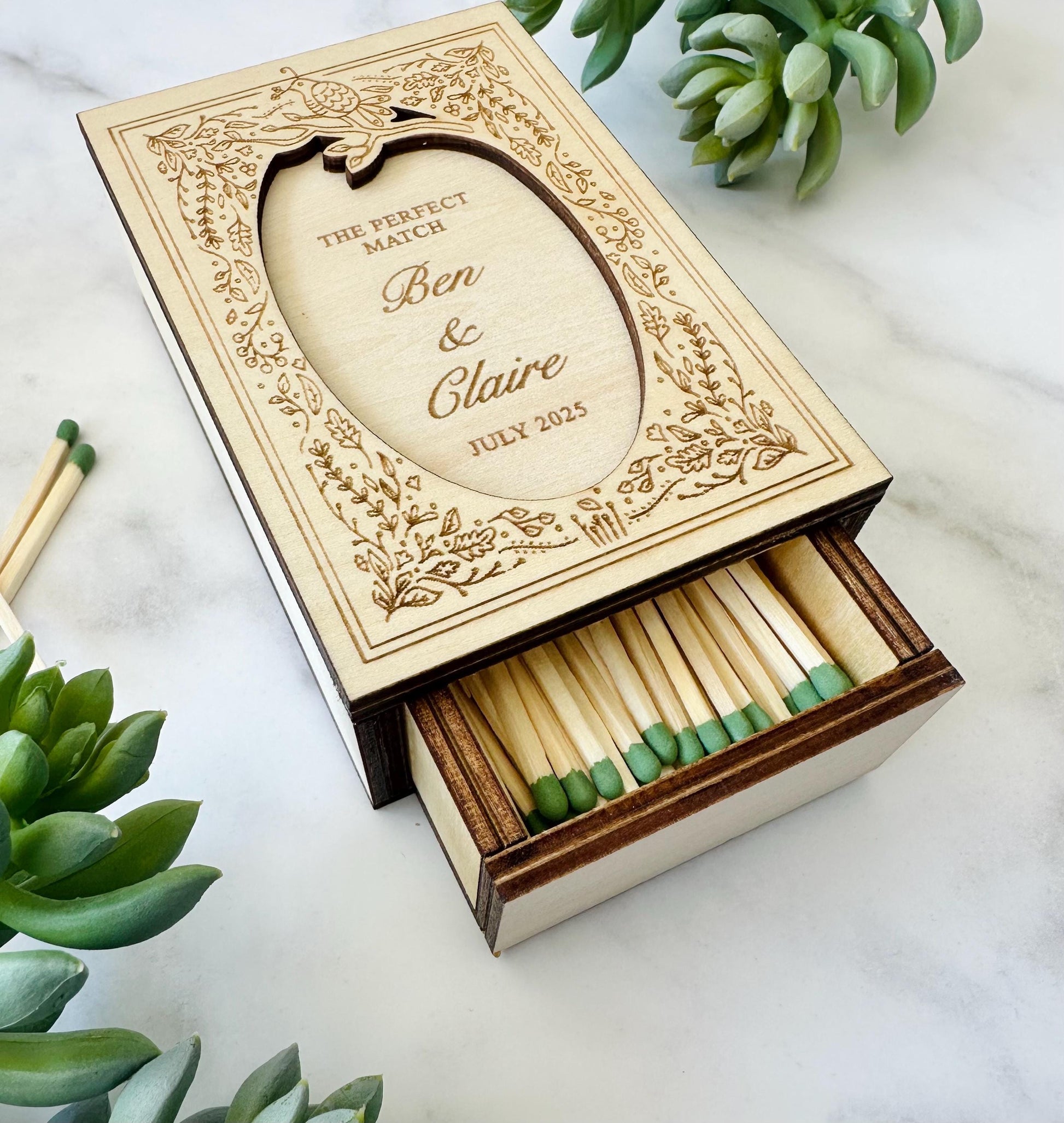 - Customization: Personalize your match box with you loved ones names or reach out for a custom design